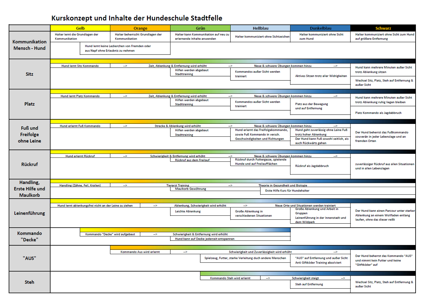 Die Erziehungskurse der Hundeschule Stadtfelle werden nicht nach dem Alter des Hundes gestaffelt, sondern basieren auf Farben ähnlich der Gürtel und Rangsysteme diverser Kampfkünste wie Judo oder Karate. Jede Leinenfarbe entspricht einem gewissen Ausbildungsstand, der in kleinen praktischen und theoretischen Prüfungen nachgewiesen werden kann. Dieses System bietet viele Vorteile für Hund und Halter:
